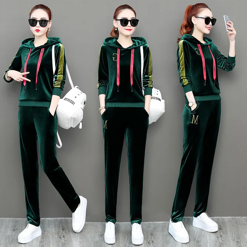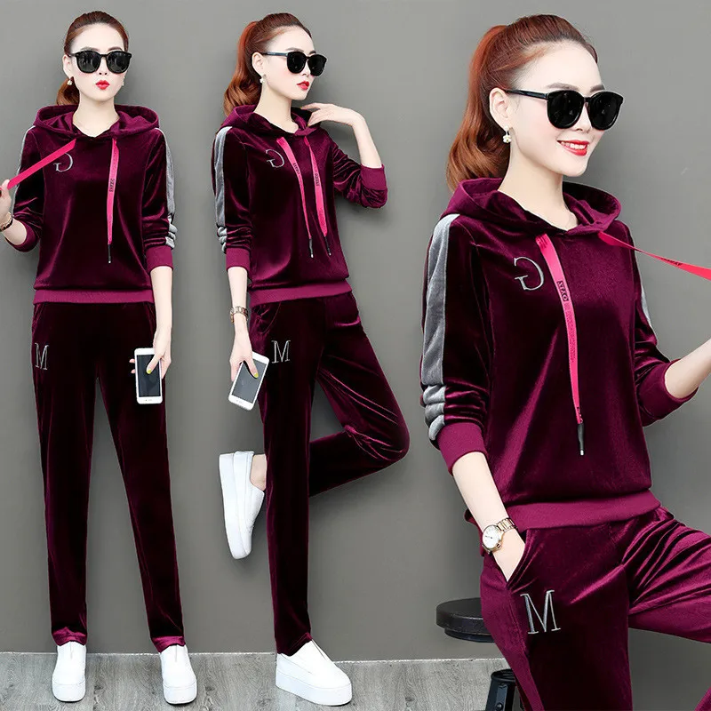 2 piece outfits for women winter wear letters embroidered student sportswear hooded gold velvet sui